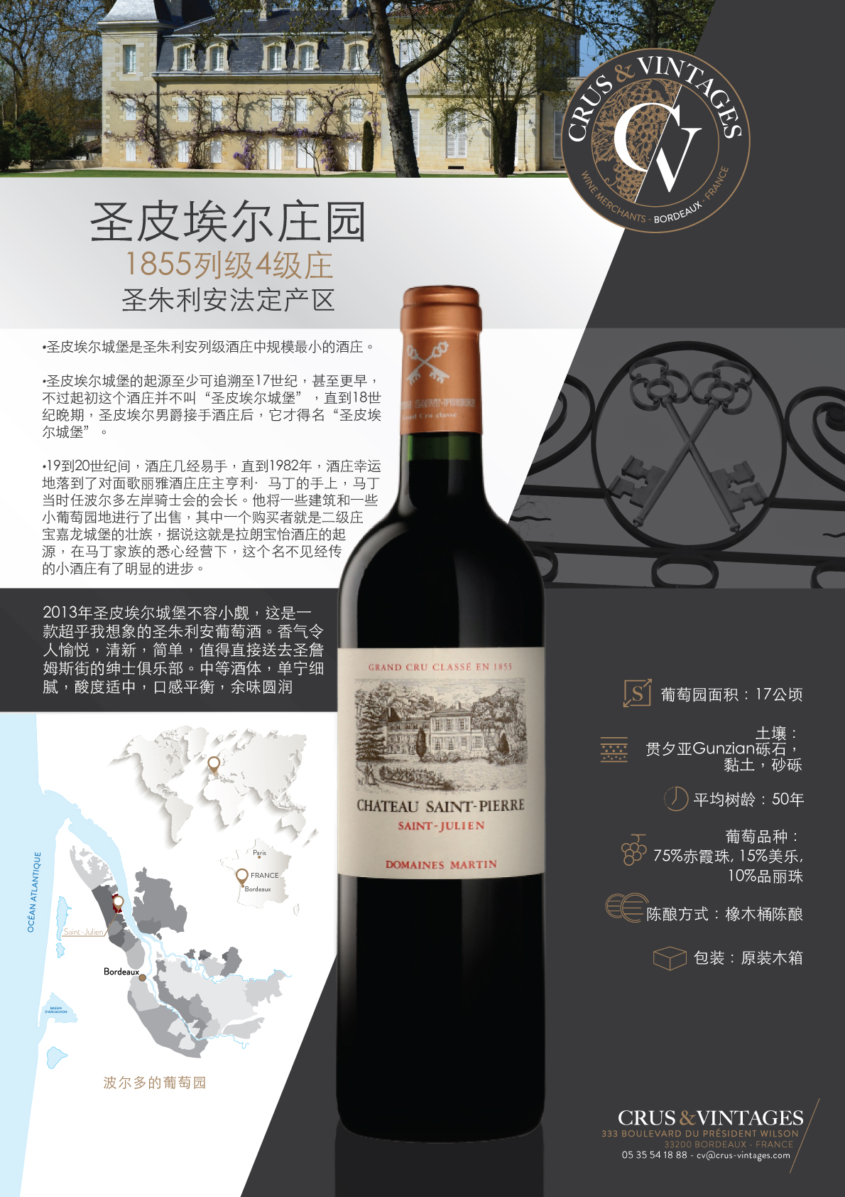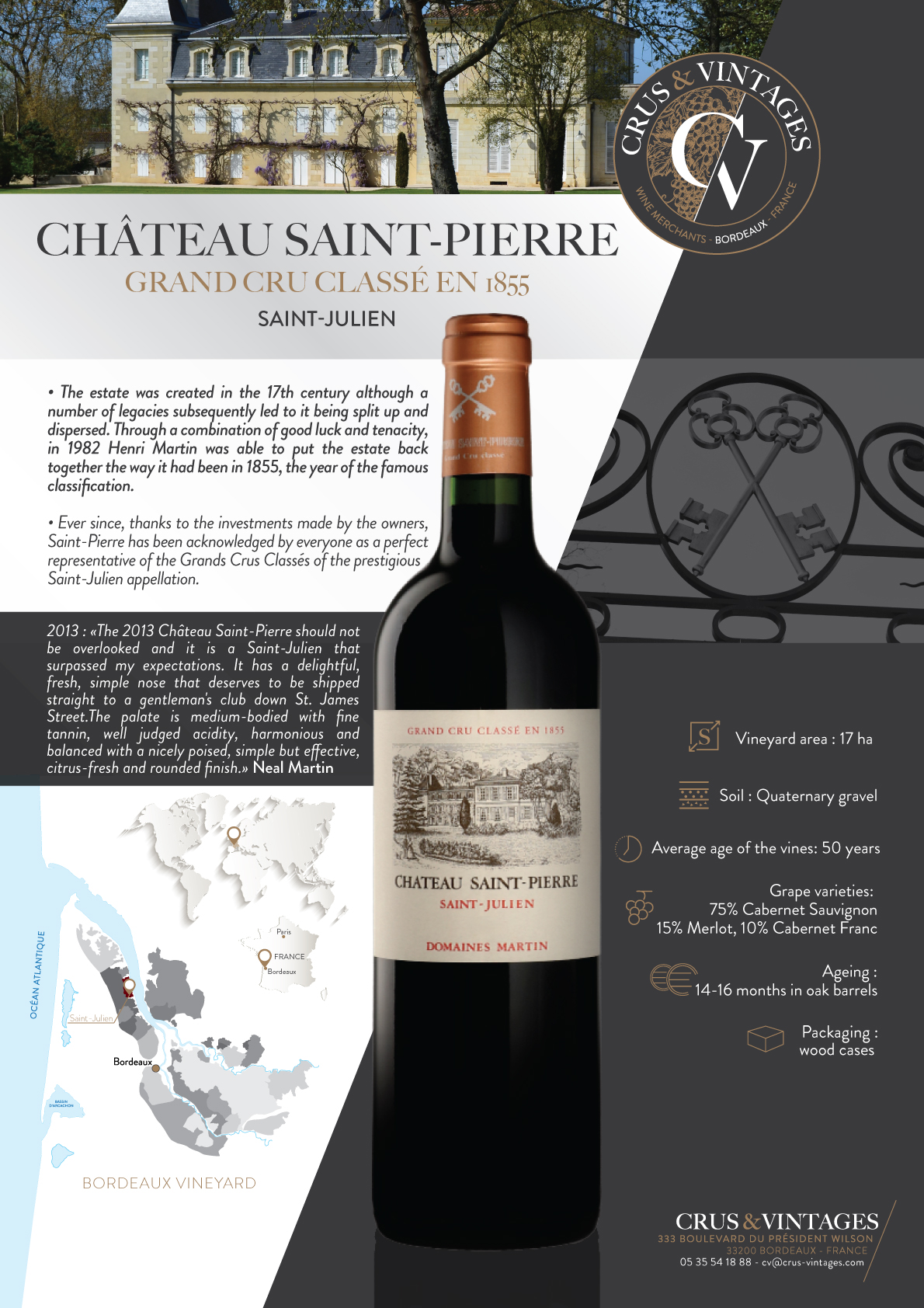 Domaine créé au 17ème siècle, ce 4ème Grand Cru Classé fut à la suite de plusieurs successions, morcelé et dispersé. Par chance et ténacité, en 1982 Henri Martin, pu reconstituer la propriété telle que connue en 1855, année du fameux classement.