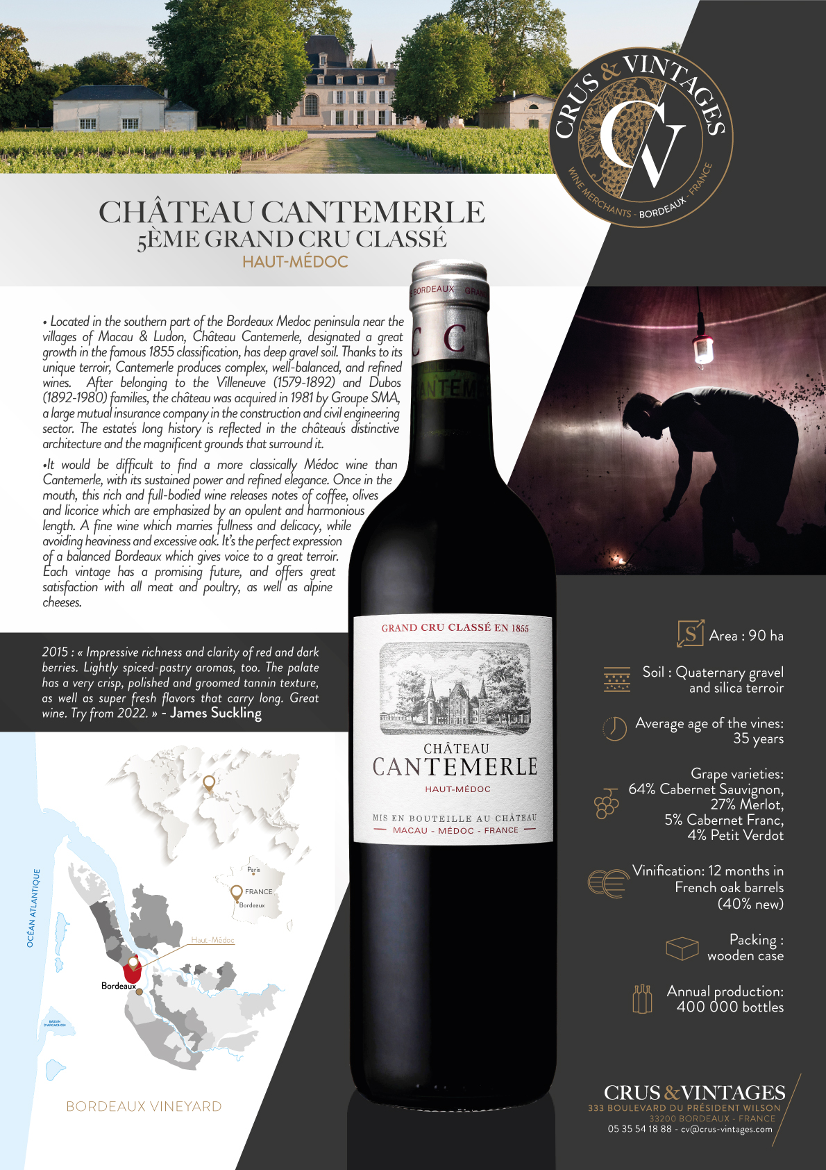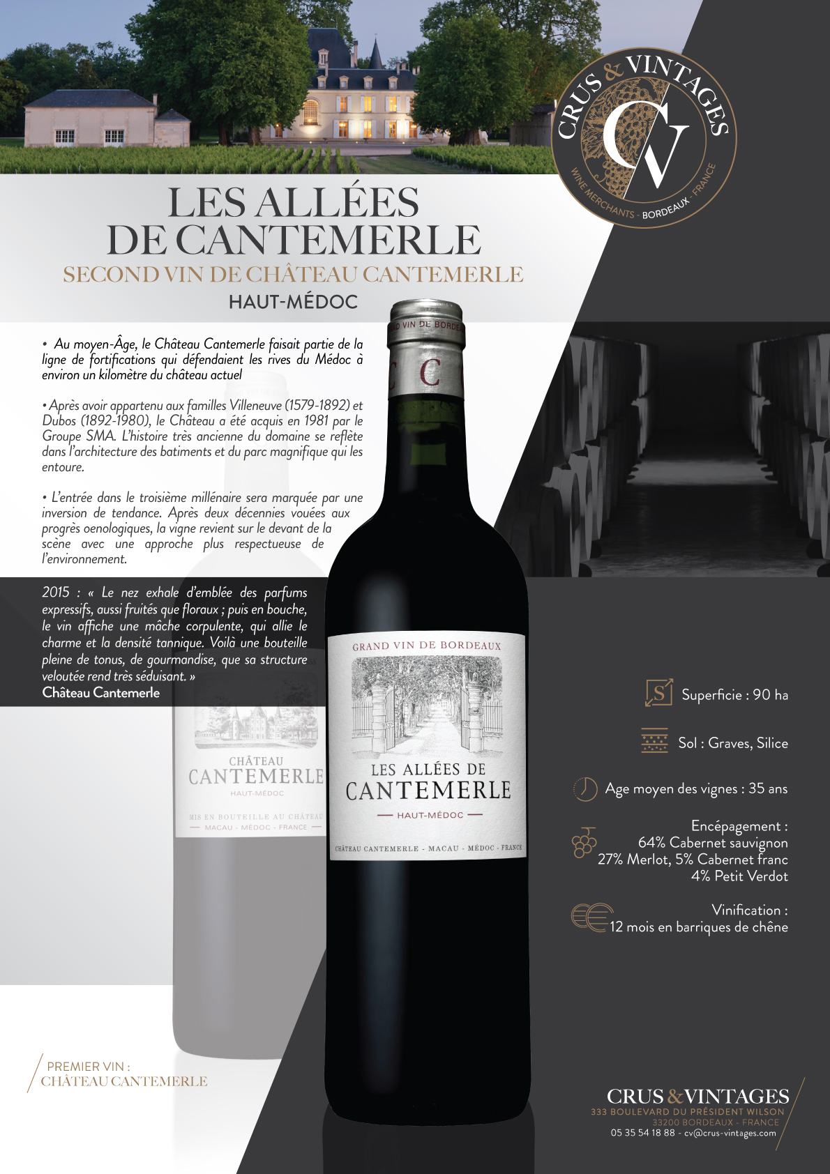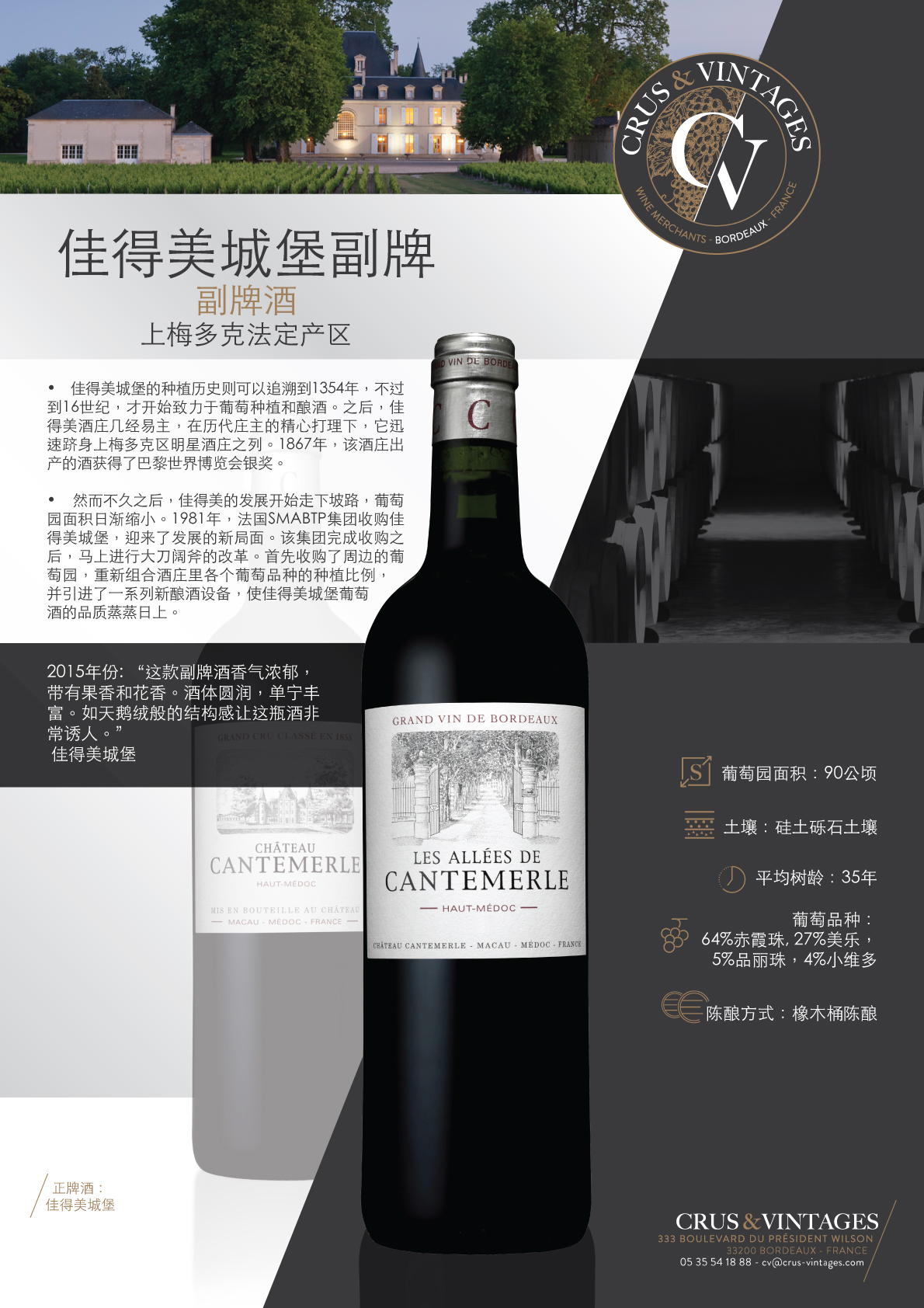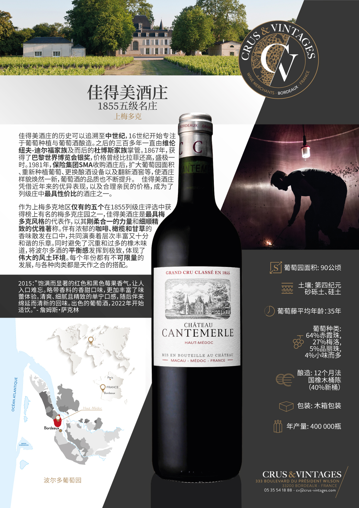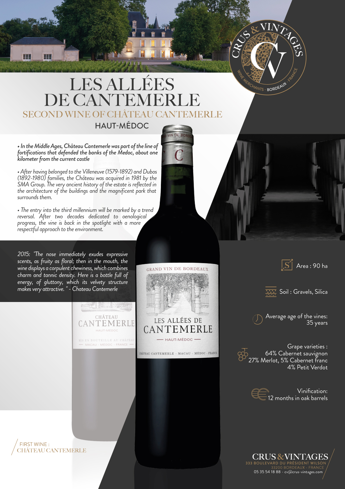 坐落在梅多克南部,在澳门和卢东村的郊区,康特梅尔酒庄的葡萄园,1855年被评为特级酒庄,绵延在一个巨大的深砾石床上。 凭借其独特的风土条件,Cantemerle生产出精致、平衡的葡萄酒,具有罕见的复杂香气。 在属于维伦纽夫(1579-1892)和杜波斯家族之后 (1892-1980),该城堡于1981年被SMA集团收购。 庄园非常古老的历史反映在其建筑上。 建筑物和环绕它们的壮丽公园。 坎特梅尔散发着魅力和浪漫的气息。